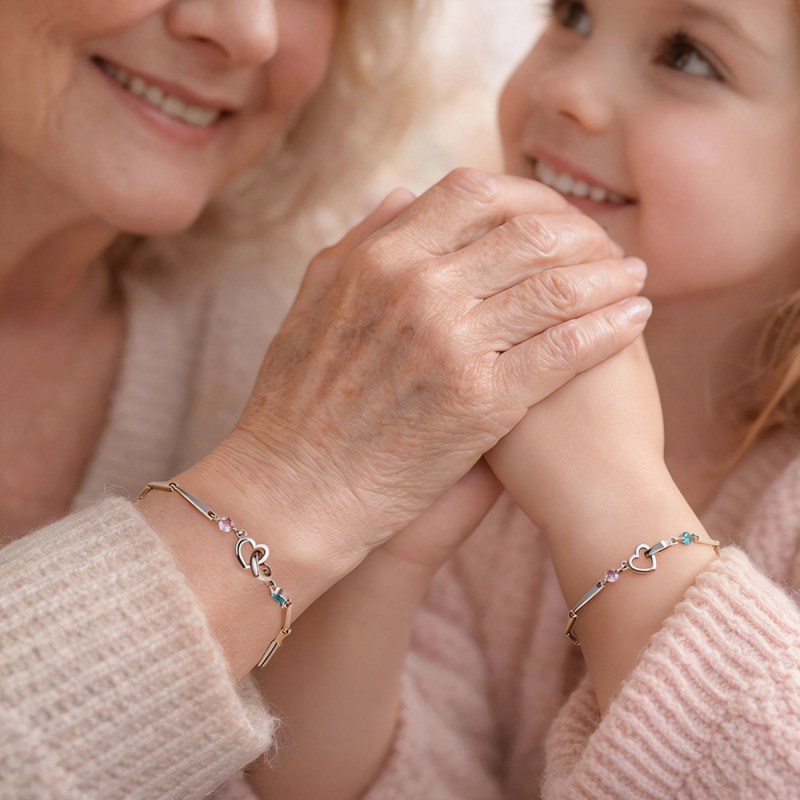 Custom Engraved Double-Heart Bracelet with Two Birthstones Personalized Keepsake for Grandmother & Grandchild