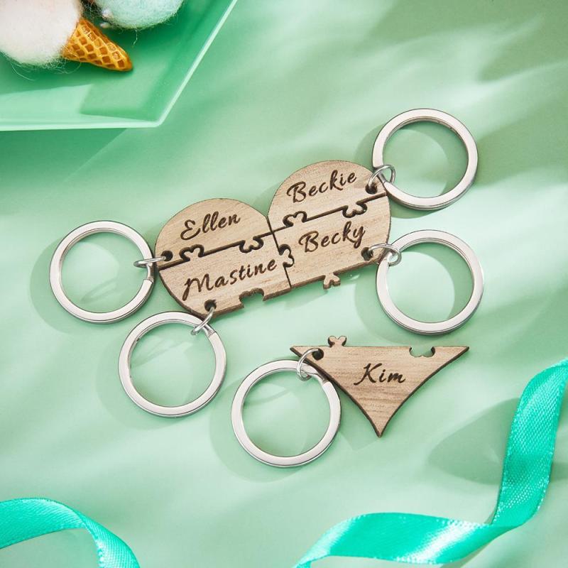 Custom Engraved Five Piece Heart Name Jigsaw Keychain Wooden Key Ring