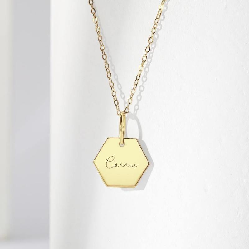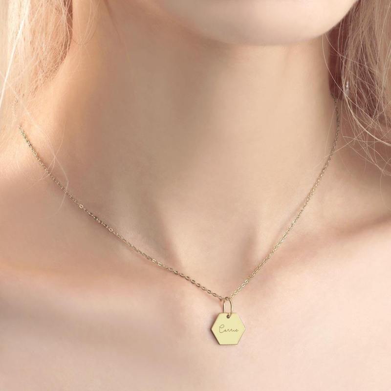 Custom Engraved Hexagon Necklace Tag Necklace 14k Gold Plated