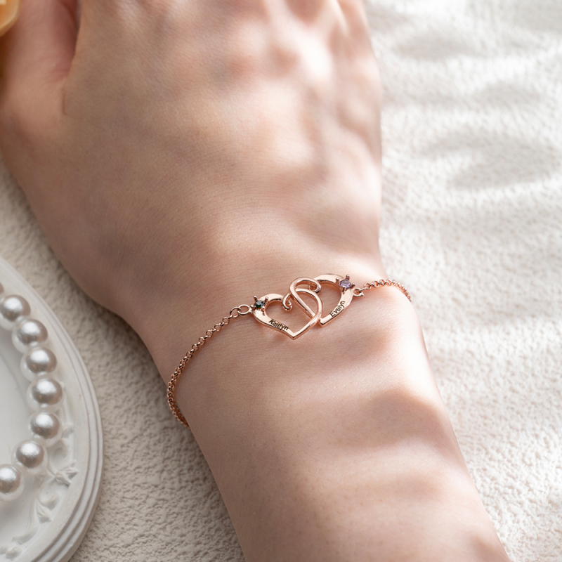 Custom Interlocking Heart Name Bracelet Birthstone Engraved Personalized Double Heart Bracelet for Couples Best Friends