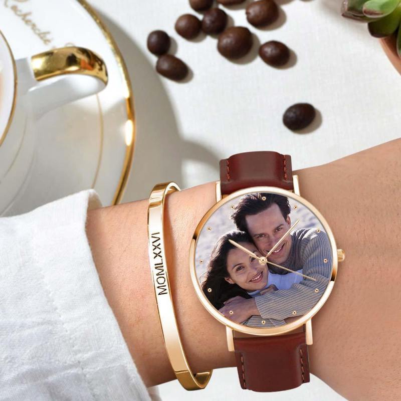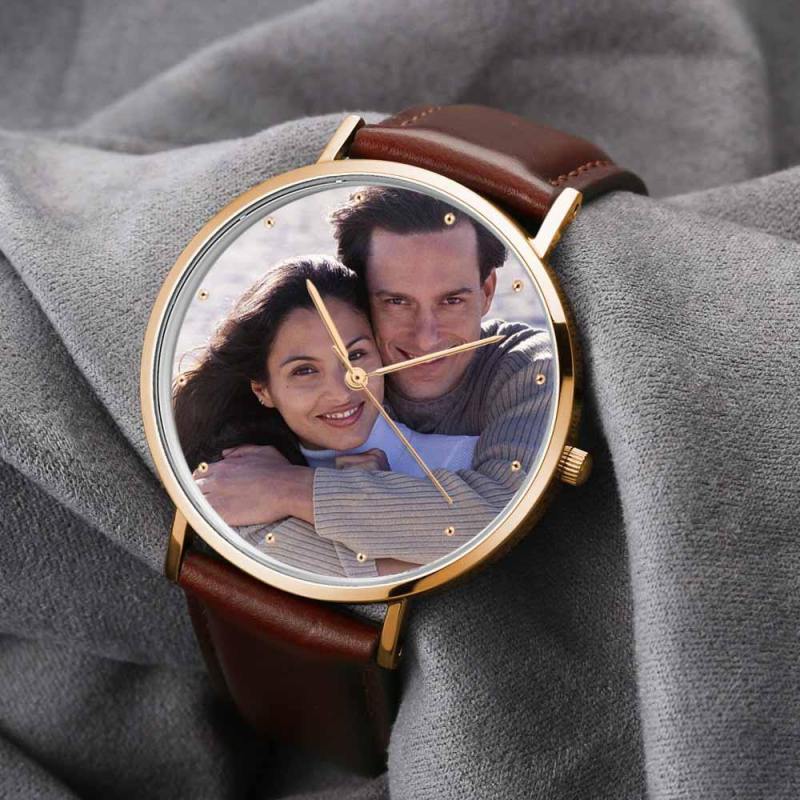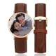 Unisex Engraved Rose Goldtone Photo Watch Brown Leather Strap 40mm
