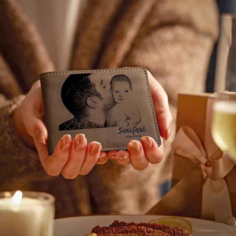 Men's Bifold Custom Inscription Photo Engraved Wallet - Brown Leather