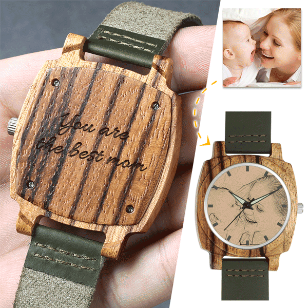 Men's Engraved Bamboo Photo Watch Dark Green Leather Strap 45mm