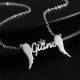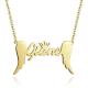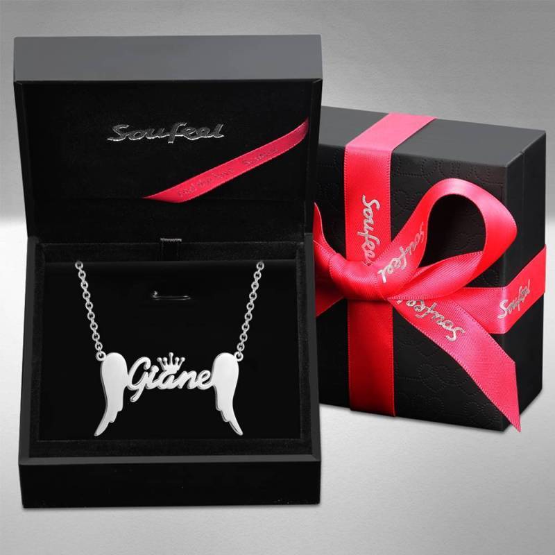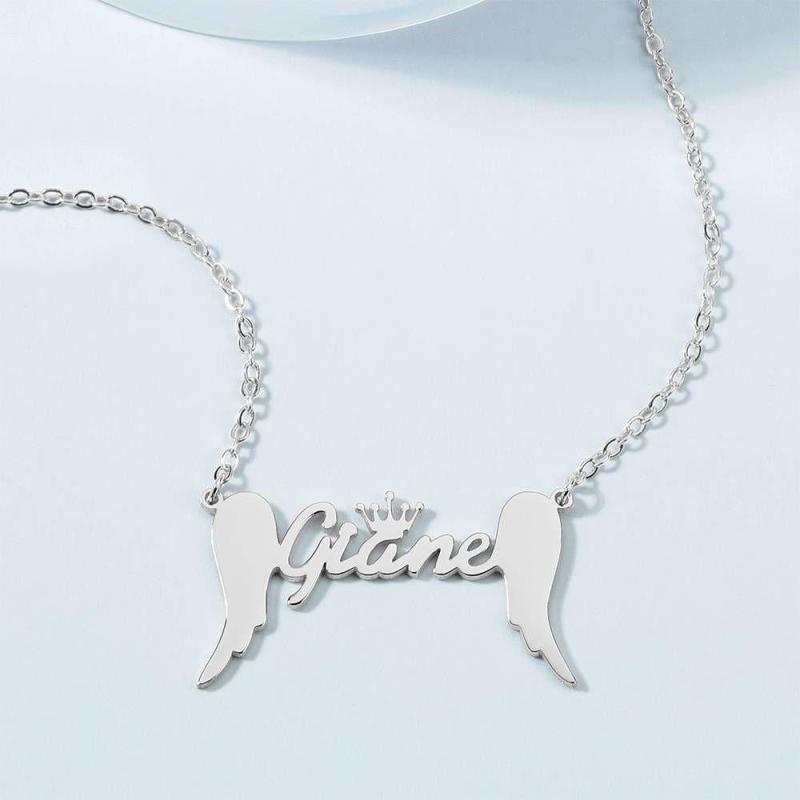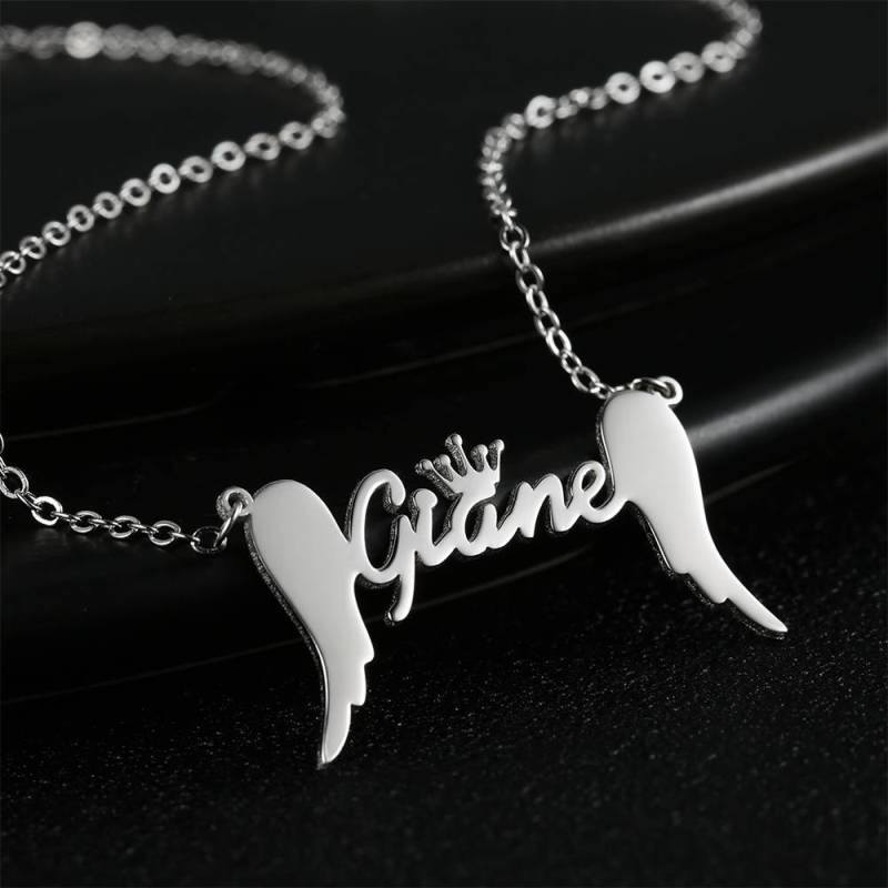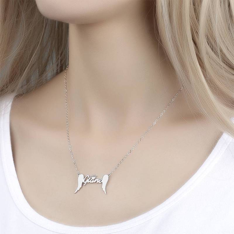 Name Necklace, Crown Name Necklace with Angel Wings Platinum Plated - Silver