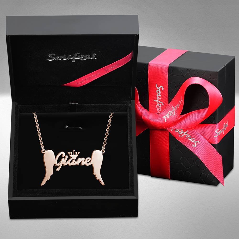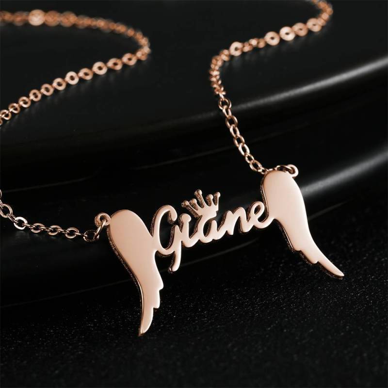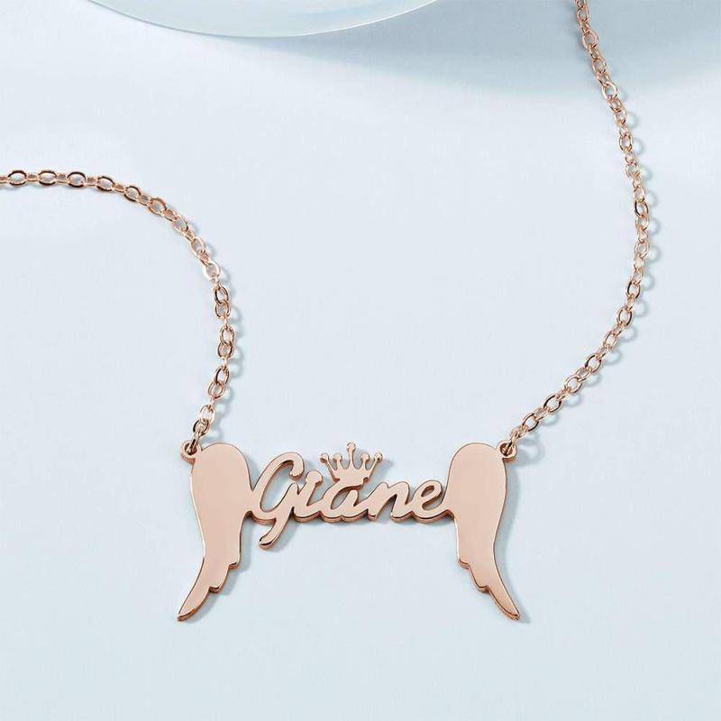 Name Necklace, Crown Name Necklace with Angel Wings Rose Gold Plated