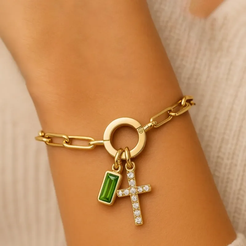 Paperclip Birthstone Cross Pendant Bracelet Custom Paperclip Chain Cross Bracelet with Birthstone – Detachable Pendant Personalized Jewelry for Women