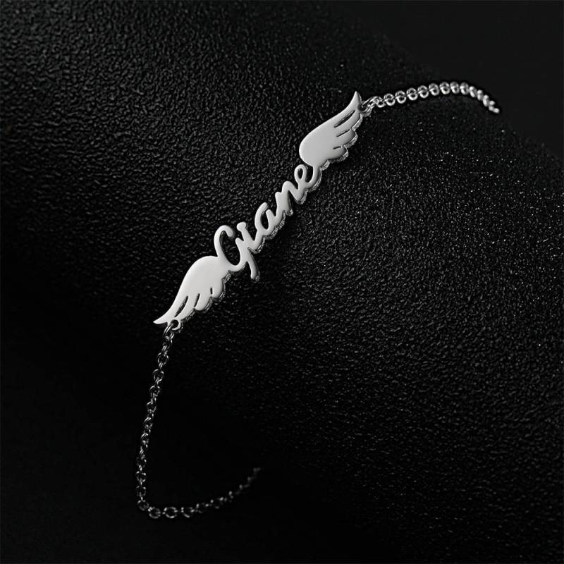 Personalised Angel Wings Name Bracelet Platinum Plated Silver