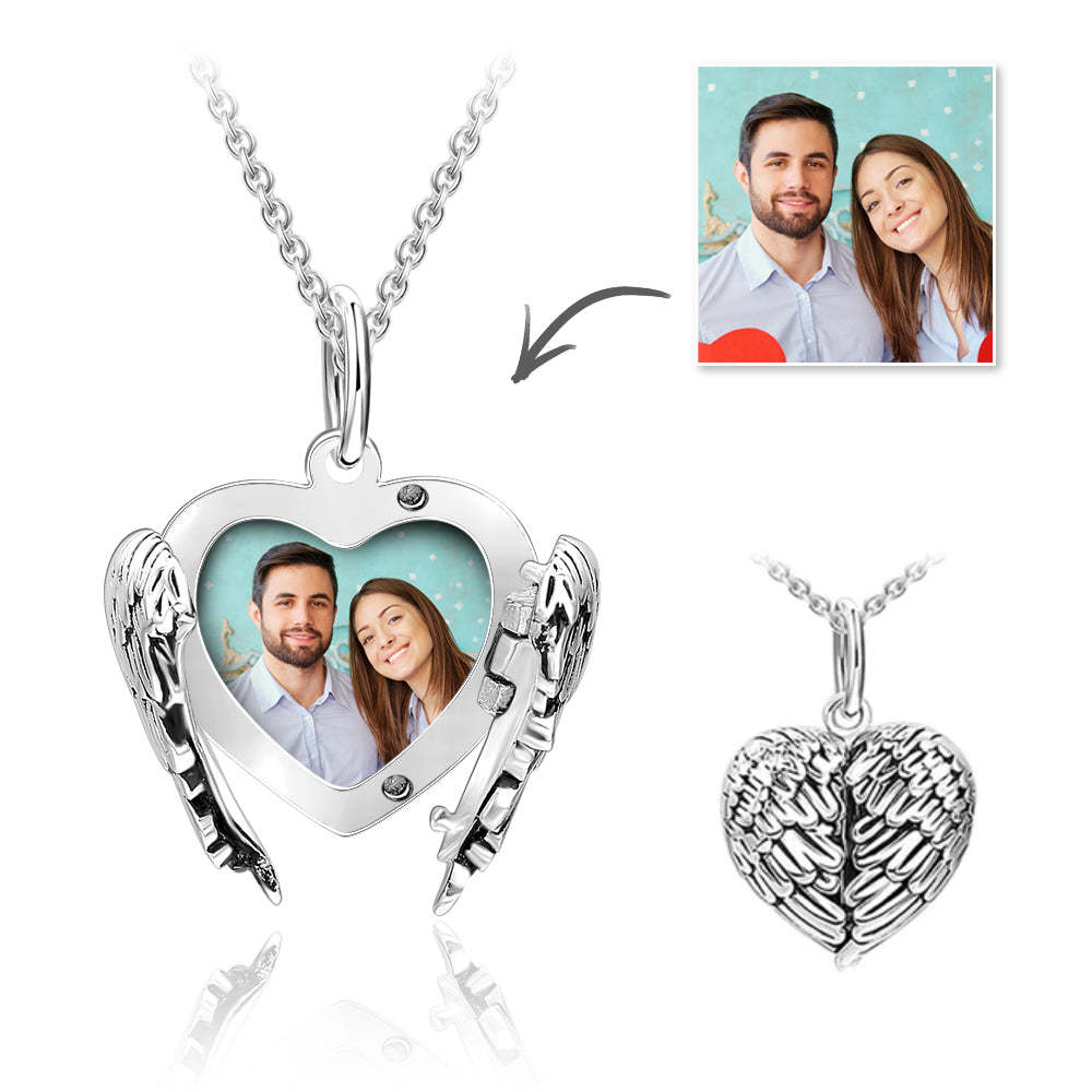 Personalized Engravable Photo Locket Necklace Valentine's Day Gift Heart Angel Wings