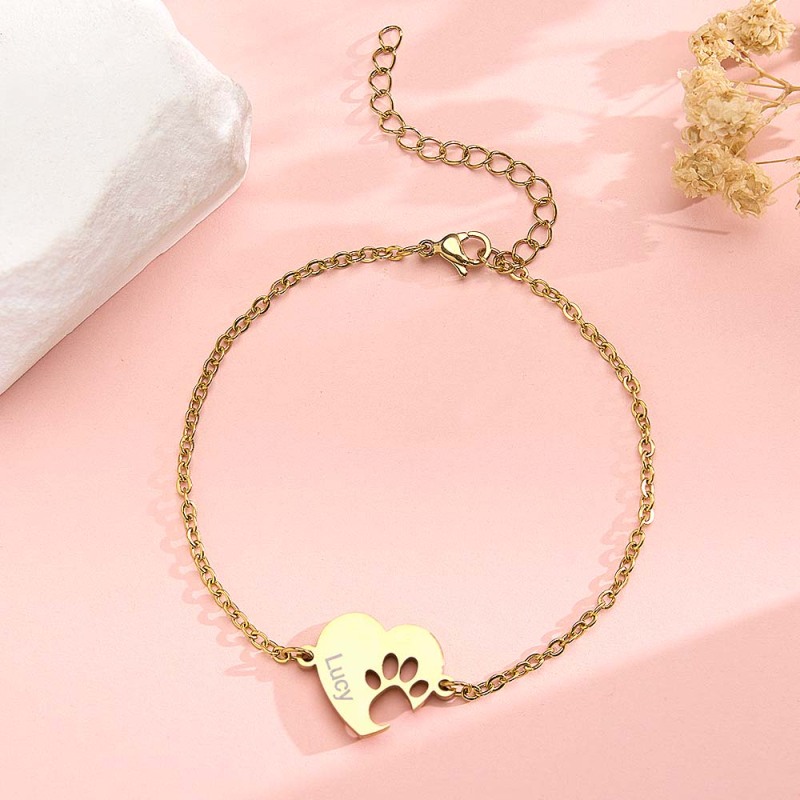 Personalized Heart Paw Print Bracelet – Custom Pet Name Jewelry for Pet Lovers