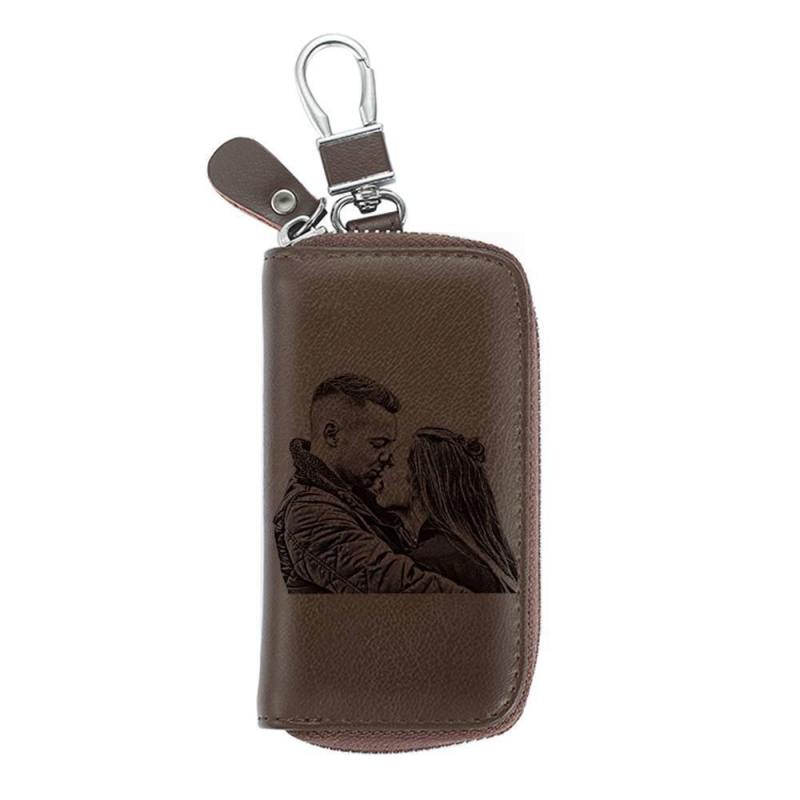 Photo Engraved Key Wallet, Leather Key Case Brown