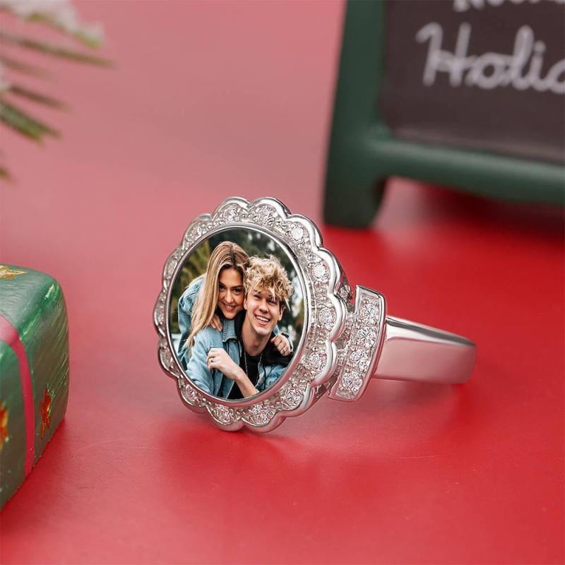 Photo Ring Round Photo with Zircon Mother's Gift Platinum Plated